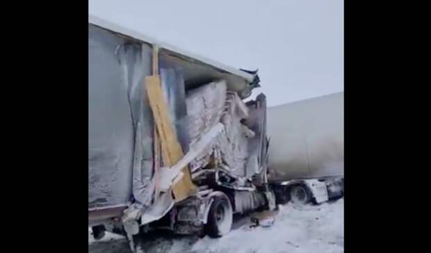Судя по видео, на трассе столкнулись два большегруза. В результате кабина одного из грузовиков оказалась «всмятку».